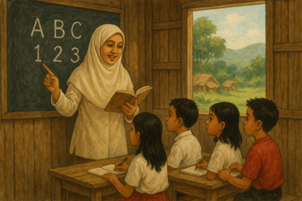 Di tengah ladang dedaunan bergemerisik pelan ditiup angin. Ari duduk di atas tikar anyaman membuka buku pelajaran dengan senyum lebar. Suara langkah kaki bu Alina pelan namun pasti, menyentuh tanah ladang yang gembur sehabis hujan semalam. Langkah itu bukan sekedar gerakan, tapi tanda semangat yang terus bergulir. Dengan penuh sabar bu Alina menjelaskan materi-materi pelajaran kepada murid kebanggaannya itu. Ari menyimaknya dengan serius. Terpancar senyum di wajah bu Maya. Ia sangat bahagia melihat putranya bisa belajar kembali.
