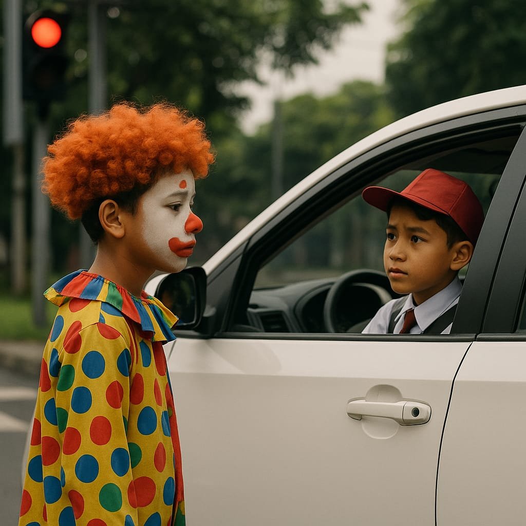 Warna merah menyala terang di ujung jalan. Suara deru mesin mulai mereda, seolah jalanan ikut menahan napas. Di tengah lajur kendaraan yang berbaris rapi, seorang anak laki-laki melangkah maju dengan kostum badut kebesaran dan wajah penuh cat warna-warni yang mulai luntur oleh peluh dan debu.