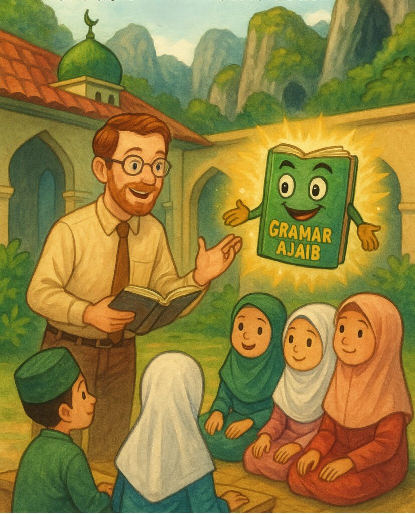 Semua murid tampak bingung. Namun tiba-tiba, tangan Maimunah, murid paling pendiam, terangkat. Dengan suara lirih ia menjawab, “Ibuku sedang memasak… di kutchen?”